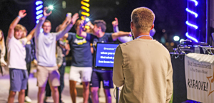 同学会 is held the fourth week of September every year 和 is a time to celebrate our 皇冠体育 pride! 校园被蓝色和金色覆盖,一周中的每一天都有活动。 一些标志性的返校活动包括赛前动员大会和深夜早餐,学生组织和田径比赛,辉光之夜等等!
